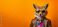 • Cool looking fox wearing funky fashion dress - jacket, shirt, dark shades sunglasses. Wide banner with copy space on side. Stylish animal posing. Generative AI