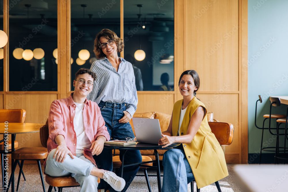 Obrazy Pejzaż - Three colleagues in a casual setting discussing ideas and working on a laptop #1505537440