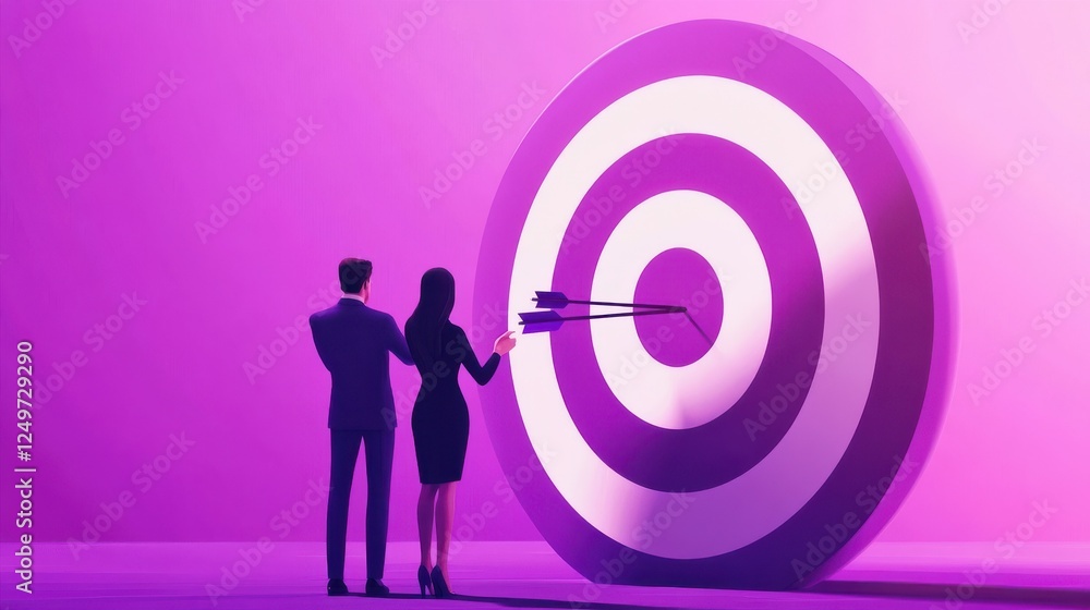Fioletowa Naklejka - Businessmen working and woman at big target with arrow. Goals and objectives, business grow and... #1249729290