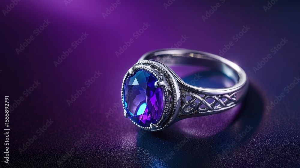 Chabrowa Naklejka - Jewelry with gemstones luxury silver ring with Amazon Stone on a dark violet background #1555892791