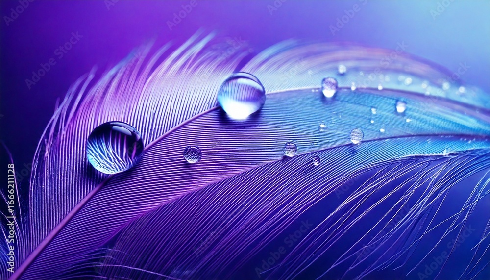 Chabrowa Naklejka - Beautiful transparent drops of rain water on a feather on a blue and violet background, macr.jpg #1666211128