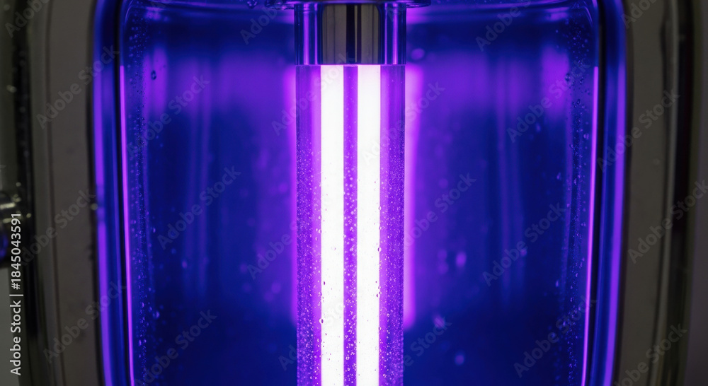 Chabrowa Naklejka - Modern ultraviolet light glows with purple hue during water purification process. Advanced... #1845043591