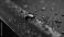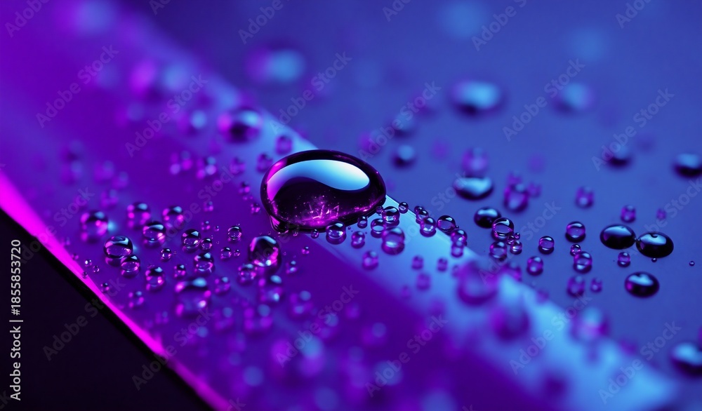 • Vibrant purple and blue light illuminates delicate water droplets on a sleek, reflective surface, creating a captivating glow.