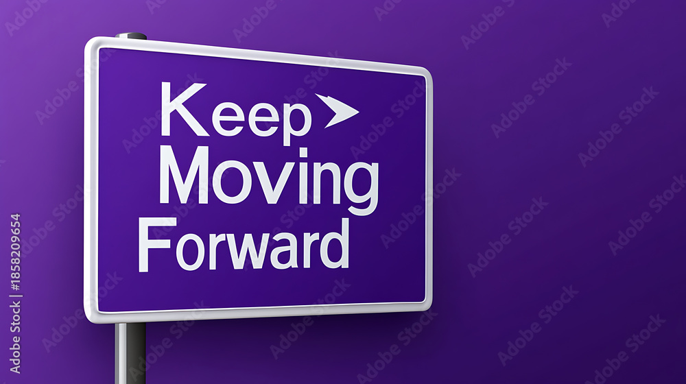 • Purple sign with the phrase "Keep Moving Forward" in white letters. The sign's message emphasizes perseverance and progress on a violet background. Motivation for growth.