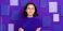 • Brunette hair girl young female notebook top violet woman goggles stand confident against creative wall background with many book cover design around her thinking happy mood