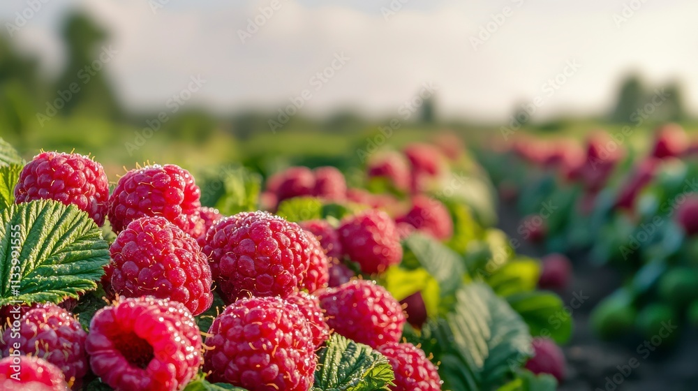 • Fresh and Juicy Raspberries in a Sunny Field with Dewy Leaves, Capturing the Essence of Berry Harvesting in a Beautiful Rural Landscape