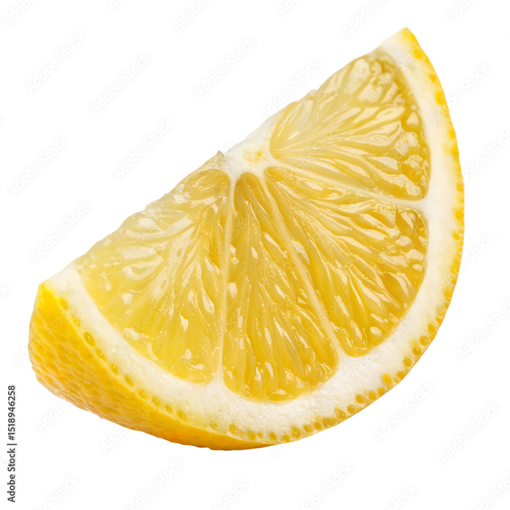 • Close up of a single lemon wedge with visible pulp and yellow rind edge on transparent background