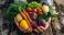 Close-up of hands holding fresh organic vegetables and fruits at a vegan festival rustic wooden table background warm natural light real photo stock photography