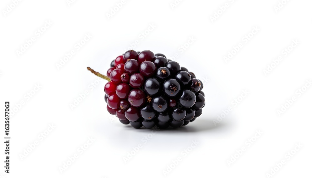 • A single, ripe mulberry fruit takes center stage, its elongated, bumpy surface intensely focused against a stark white backdrop