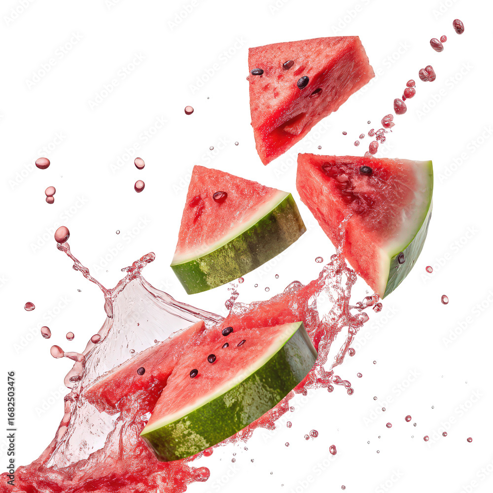 Naklejka do Kuchni - Flying pieces of watermelon with juice splashing and drops isolated png refreshing summer fruit... #1682503476