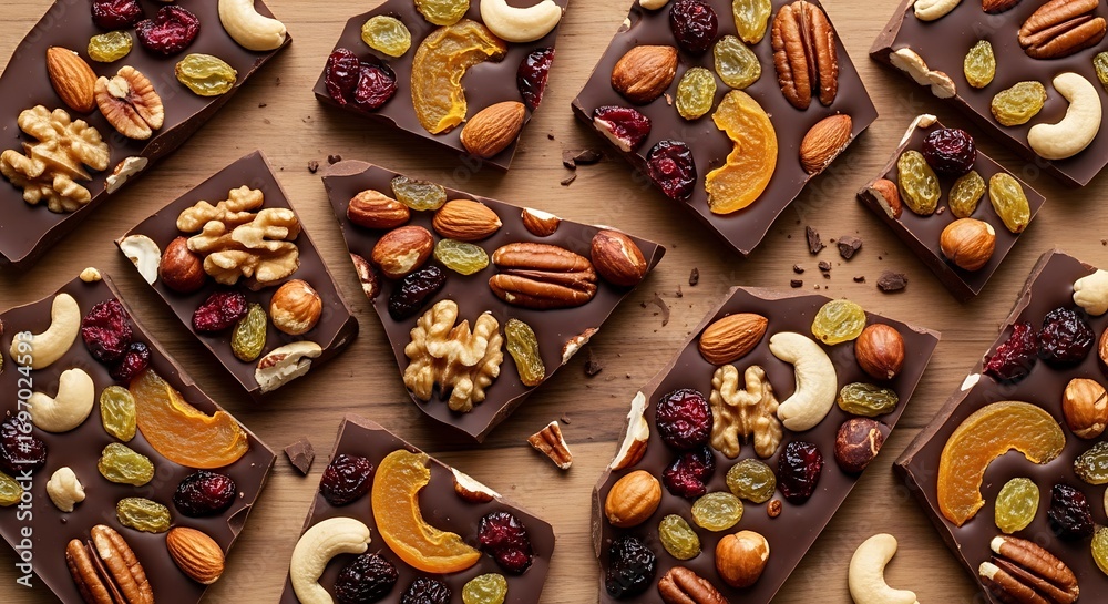 • Delicious Chocolate Bark Topped With Assorted Nuts And Dried Fruits Scattered On A Wooden Surface A Tempting Sweet Treat For Snacks And Desserts
