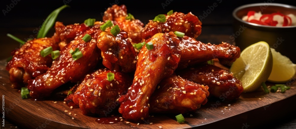 • chicken wings, barbecue sauce, spicy, crispy, lemon wedge, dark background, food photography, mouthwatering