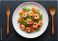 • A white plate filled with a delicious shrimp and vegetable stirfry, served with rice and garnished with fresh herbs