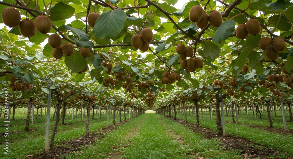Naklejka do Kuchni - Kiwi Fruit Orchard: Rows of Fruit-Laden Vines #1740379387