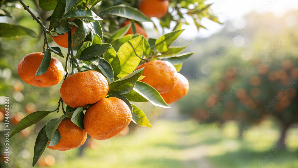 • Mandarin hanging on tree in garden, Mandarin on tree in natural warm sunlight background