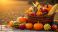 • A woven basket overflowing with autumn harvest vegetables and fruits at sunset