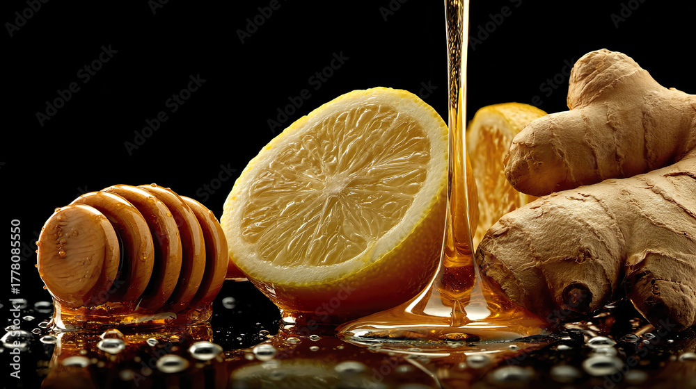 • Pouring dripping honey lemon ginger root black background healthy immunity vitamins