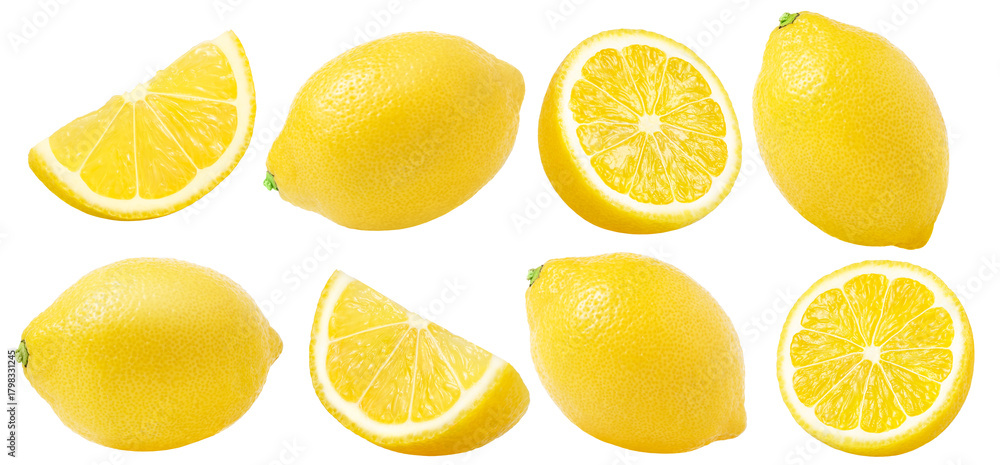• Collection of lemons isolated, no shadow. Whole lemon, slice of lemon and half of lemon with clipping path without shadows.