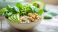 • A vibrant bowl filled with leafy greens, sliced avocado, quinoa, and chickpeas is placed on a wooden table. The bright kitchen setting adds a fresh feel, showcasing healthy eating.