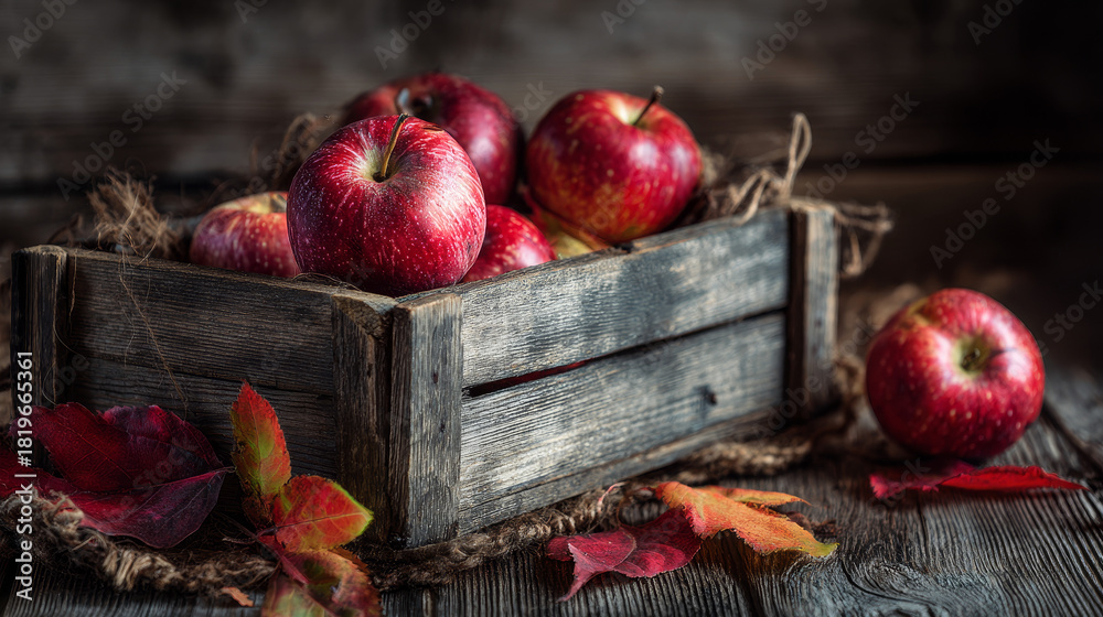 Naklejka do Kuchni - Red apples in a rustic wooden crate. Autumn leaves and fruits scattered on a dark wooden surface.... #1819665361