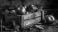 • Red apples in a rustic wooden crate. Autumn leaves and fruits scattered on a dark wooden surface. Toned image with selective focus and space for text.