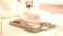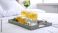 • A tray of water glasses with lemon slices and mint sprigs sits on a bed with white linens. The scene is bright and airy