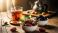 • Delicious dried dates served with hot traditional tea in a glass mug and a metal teapot on a rustic wooden table, creating a warm and inviting atmosphere for a healthy snack or dessert