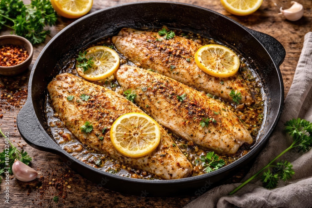 • Juicy pangasius fish fillets cooked with ground spices and lemon slices sizzling in a frying pan over textured wood