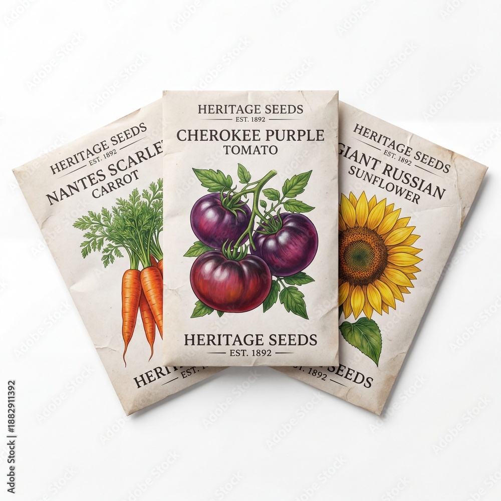 Naklejka do Kuchni - Colorful paper vegetable and flower seed packets isolated on white. #1882911392