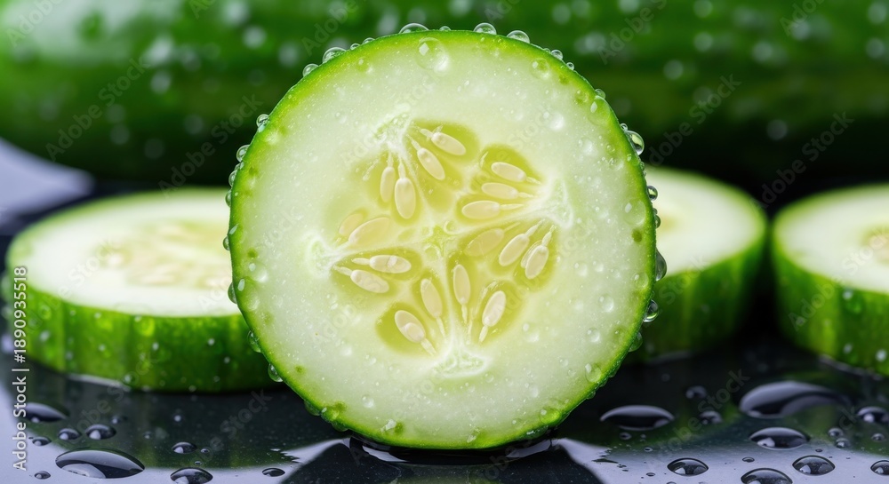Naklejka do Kuchni - Slices of fresh green vegetable rest upon a dark surface covered in condensation droplets. #1890935518