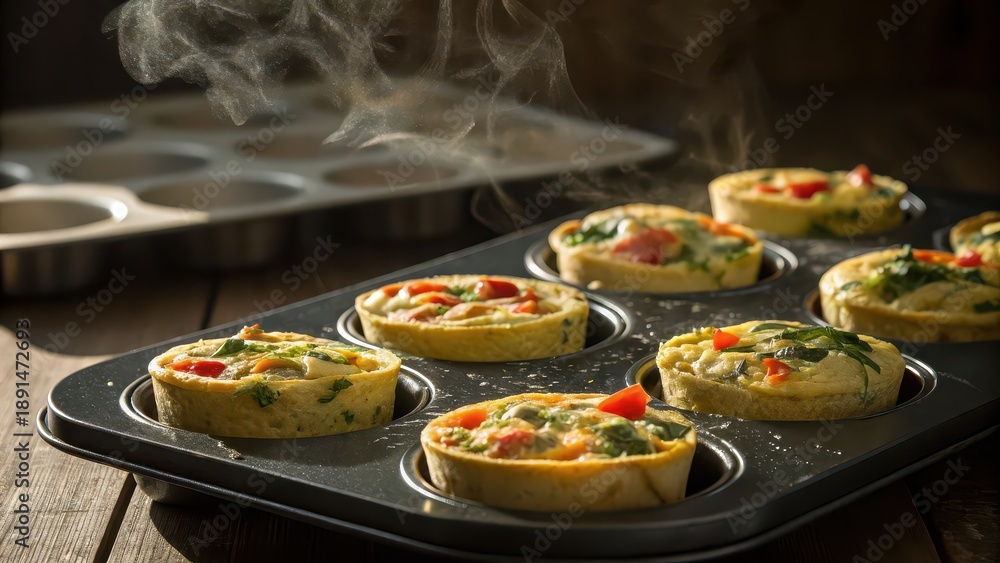 • Freshly baked vegetable egg muffins in muffin tin, healthy breakfast meal prep, low carb high protein frittata bites, keto diet snack, steaming egg cups