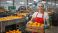 • Smiling female factory worker holding a crate of fresh oranges. Happy woman in apron and hairnet standing near fruit conveyor belt. Food processing industry concept