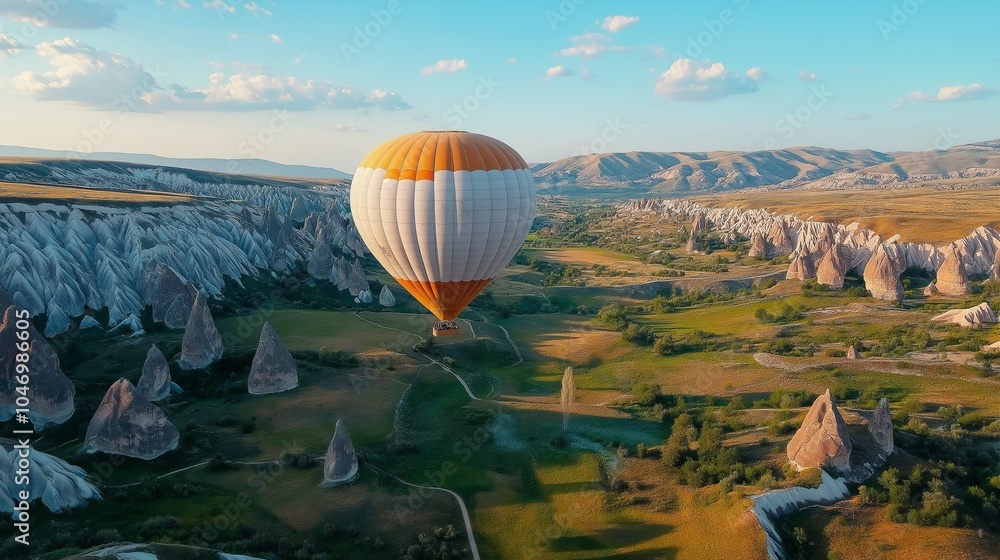 Naklejka do Pokoju Chłopca - Hot air balloon flight. Romantic date in the air. View of beautiful landscape with balloons from... #1046986605