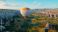 • Hot air balloon flight. Romantic date in the air. View of beautiful landscape with balloons from above. Sports competition on hot air balloons