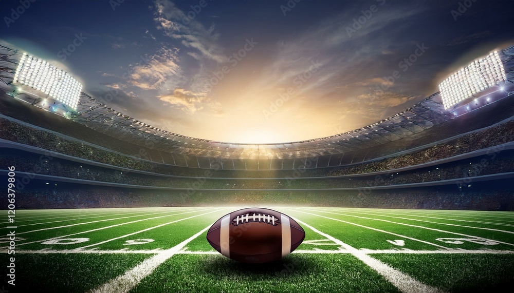 • an american football stadium with the ball in the foreground game day atmosphere and sports action