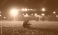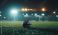 • photo of rugby ball on stadium field with blurry stadium tribunes in the background at night time with spotlights and light effects, rugby world cup concept banner, Generative AI