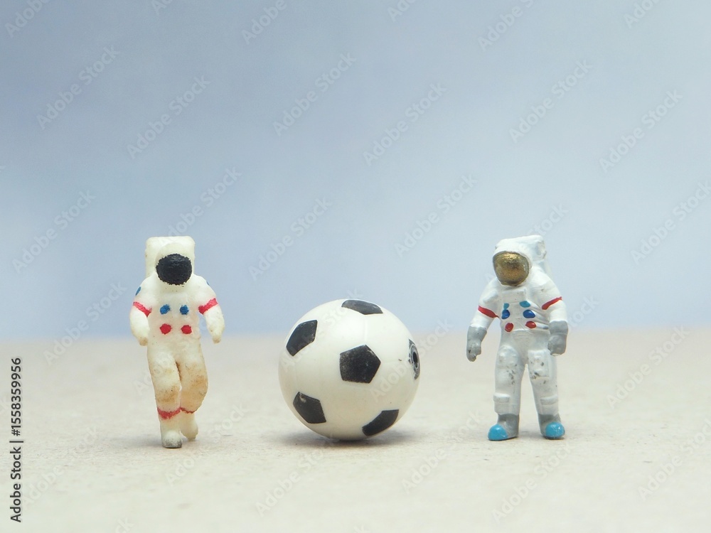 • Mini toy of action figure at outdoor with blurred background. Toy photography concept design. Astronaut at space with ball. Sportsman playing football at moon.