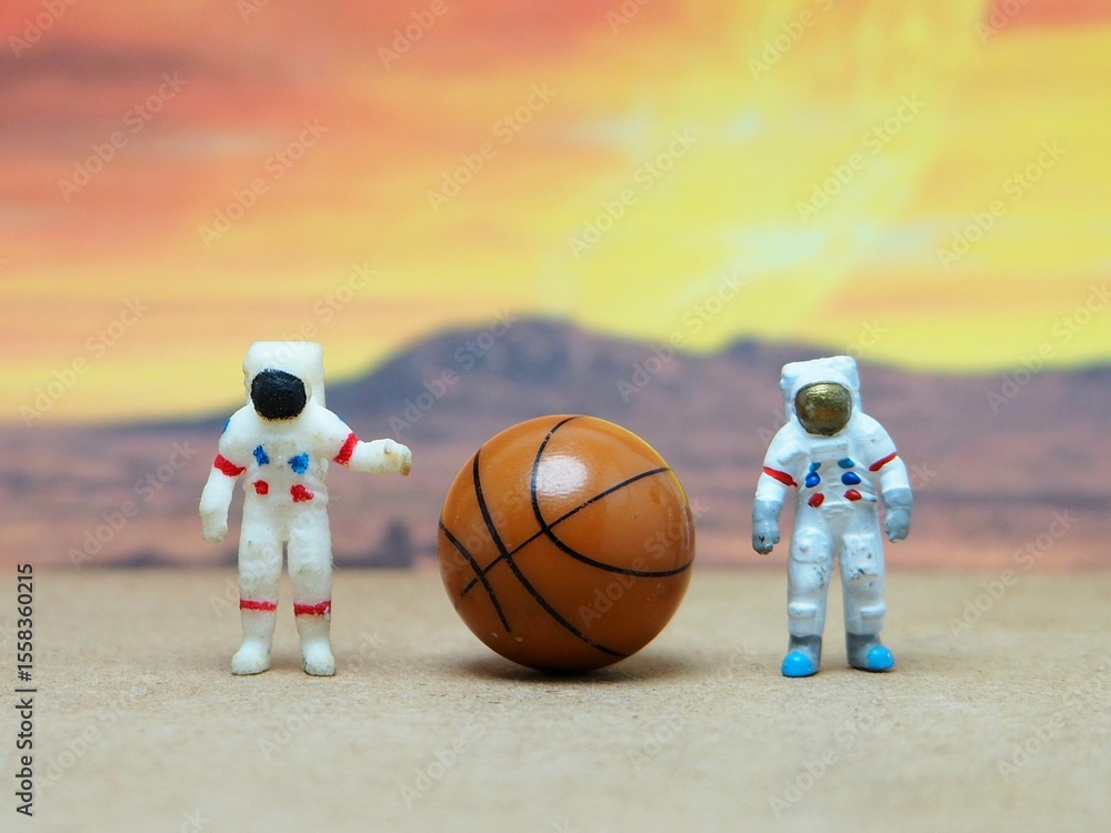 • Mini toy of action figure with blurred background. Miniature diorama photography concept design. Minifigure of Astronaut character at space with ball. Sportsman playing basketball at moon.