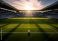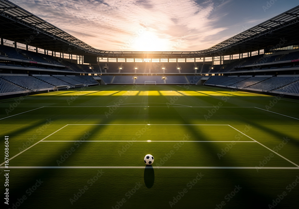• Soccer ball on a stadium field at sunset with dramatic light rays and shadows football