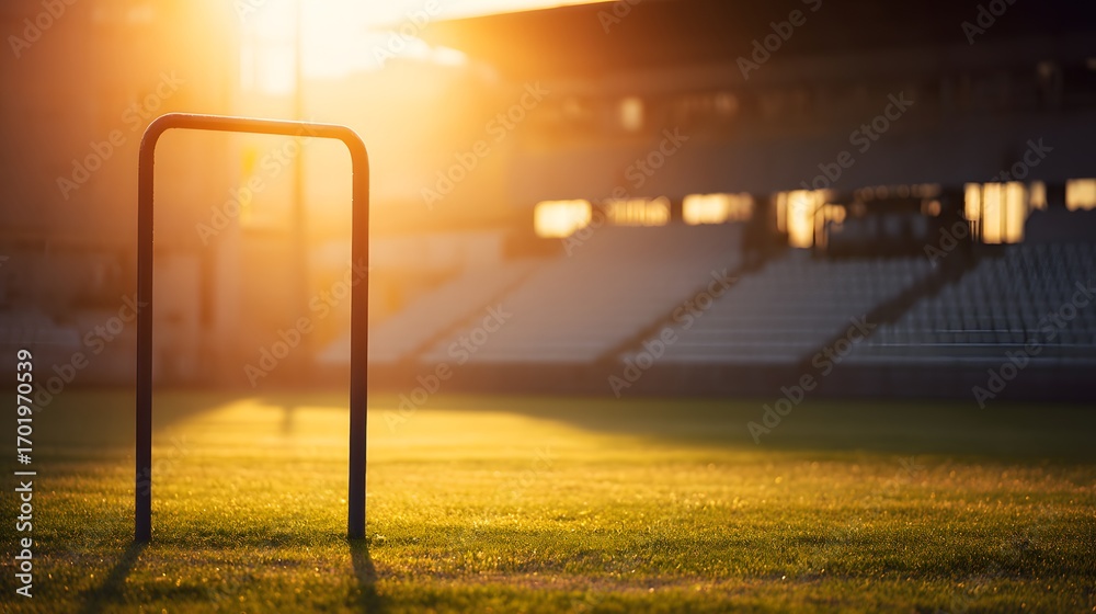 Naklejka do Pokoju Chłopca - Football goalpost on empty stadium field under dramatic sunset lighting. #1701970539