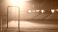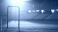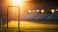 • Football goalpost on empty stadium field under dramatic sunset lighting.
