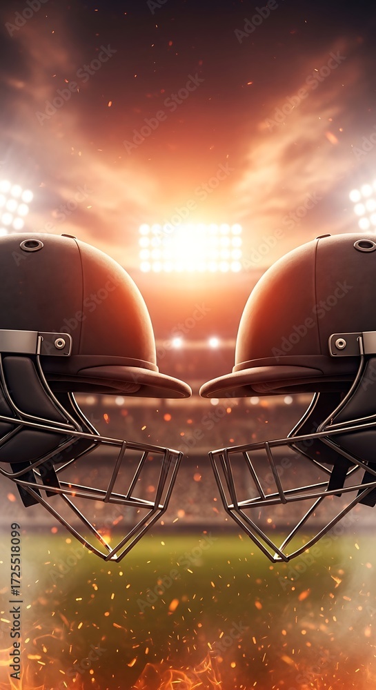• Dramatic cricket helmets facing each other under stadium lights create a powerful image for sports marketing or event promotion, conveying intensity
