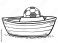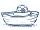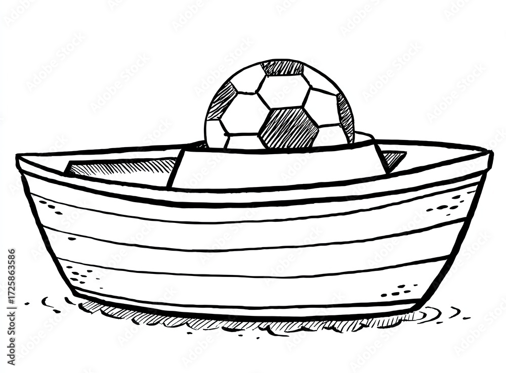 • A simple black and white cartoon drawing of a small boat with a soccer ball on top. Water ripples are shown around the boat's base. The boat is depicted with horizontal stripes