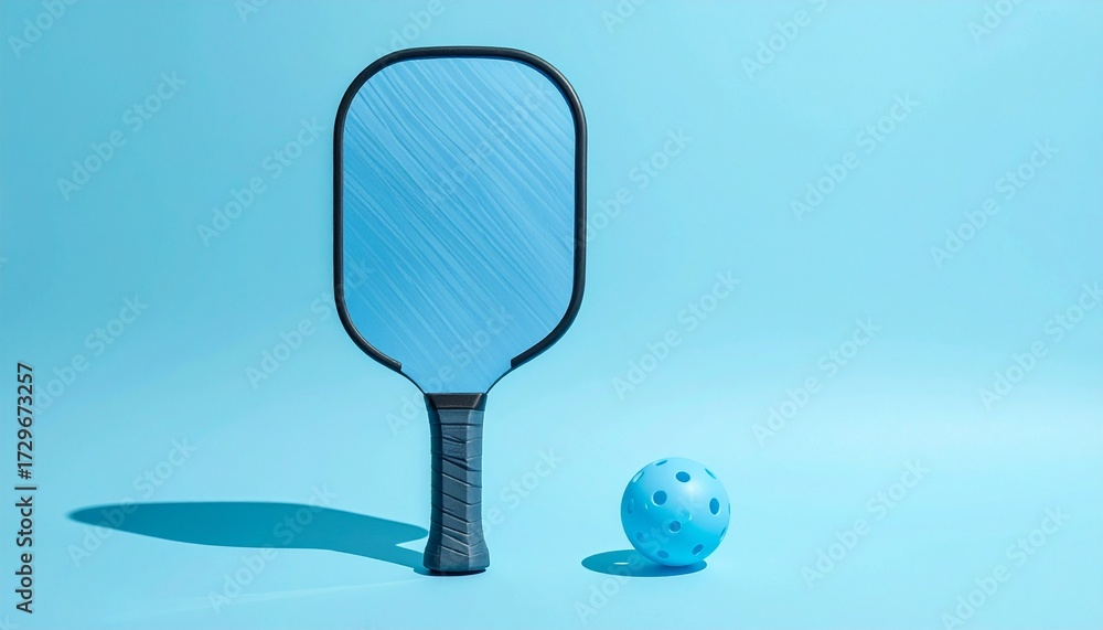• Pickleball Paddle and Ball Isolated on a Light Blue Background with Soft Shadow