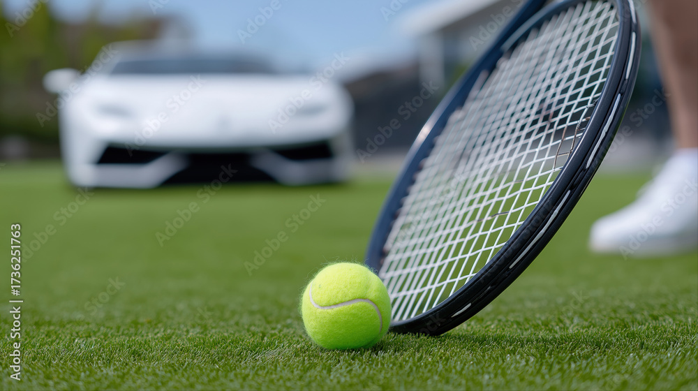 Naklejka do Pokoju Chłopca - Tennis racket and ball on grass court with white sports car in background #1736251763