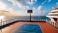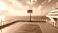 • Blurred background of the interior of a basketball court located inside a modern cruise ship with complete facilities around it, without any bright lights.