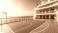 • Blurred background of the interior of a basketball court located inside a modern cruise ship with complete facilities around it, without any bright lights.
