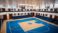 • Blurred background of the interior of a basketball court located inside a modern cruise ship with complete facilities around it, without any bright lights.
