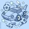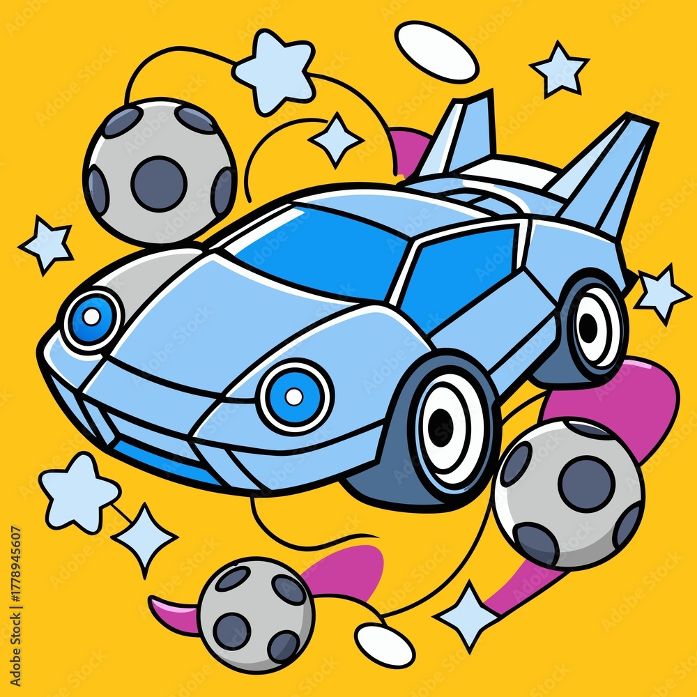 • Futuristic blue sports car with soccer balls and stars on yellow background