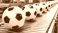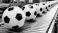 • A sequence of classic black and white soccer balls moving along a silver roller conveyor in a modern factory setting.